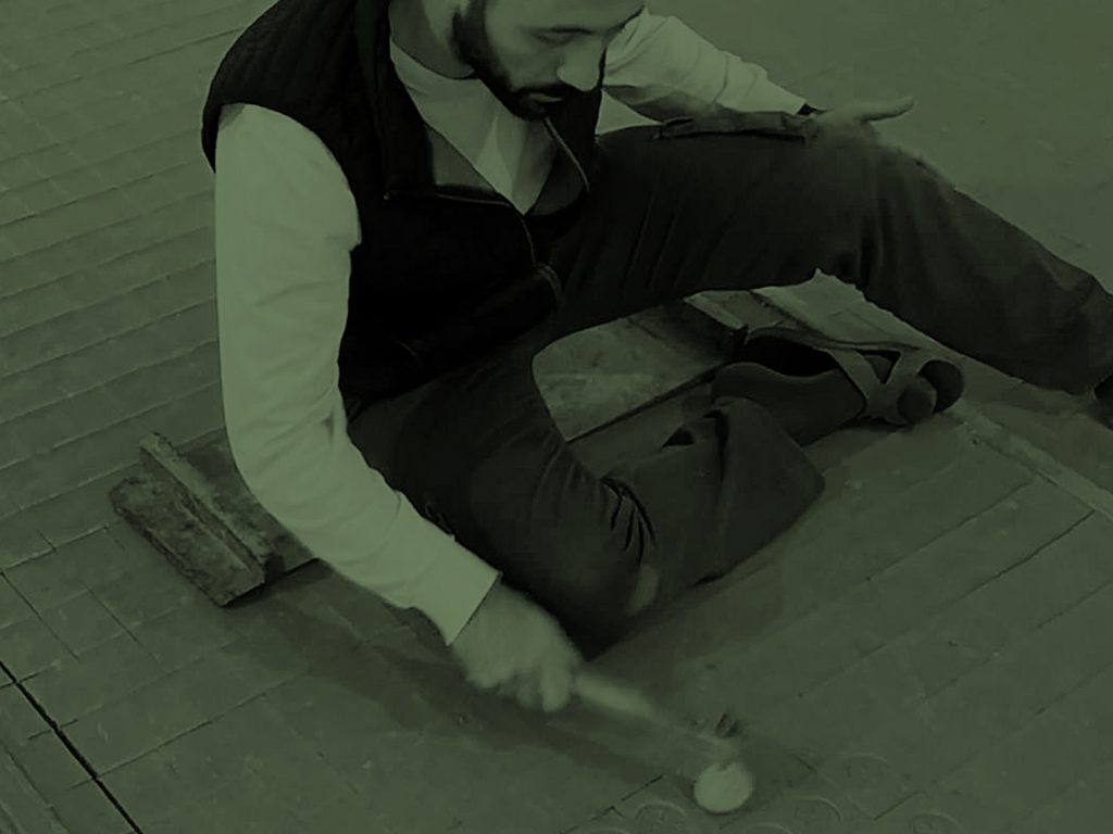 Un maître artisan ajuste la surface du savon avec une lisseuse, effectuant des gestes semi-rotatifs précis. L’épaisseur du savon est contrôlée grâce à des sondages multiples réalisés avec une latte, pour obtenir une régularité parfaite.